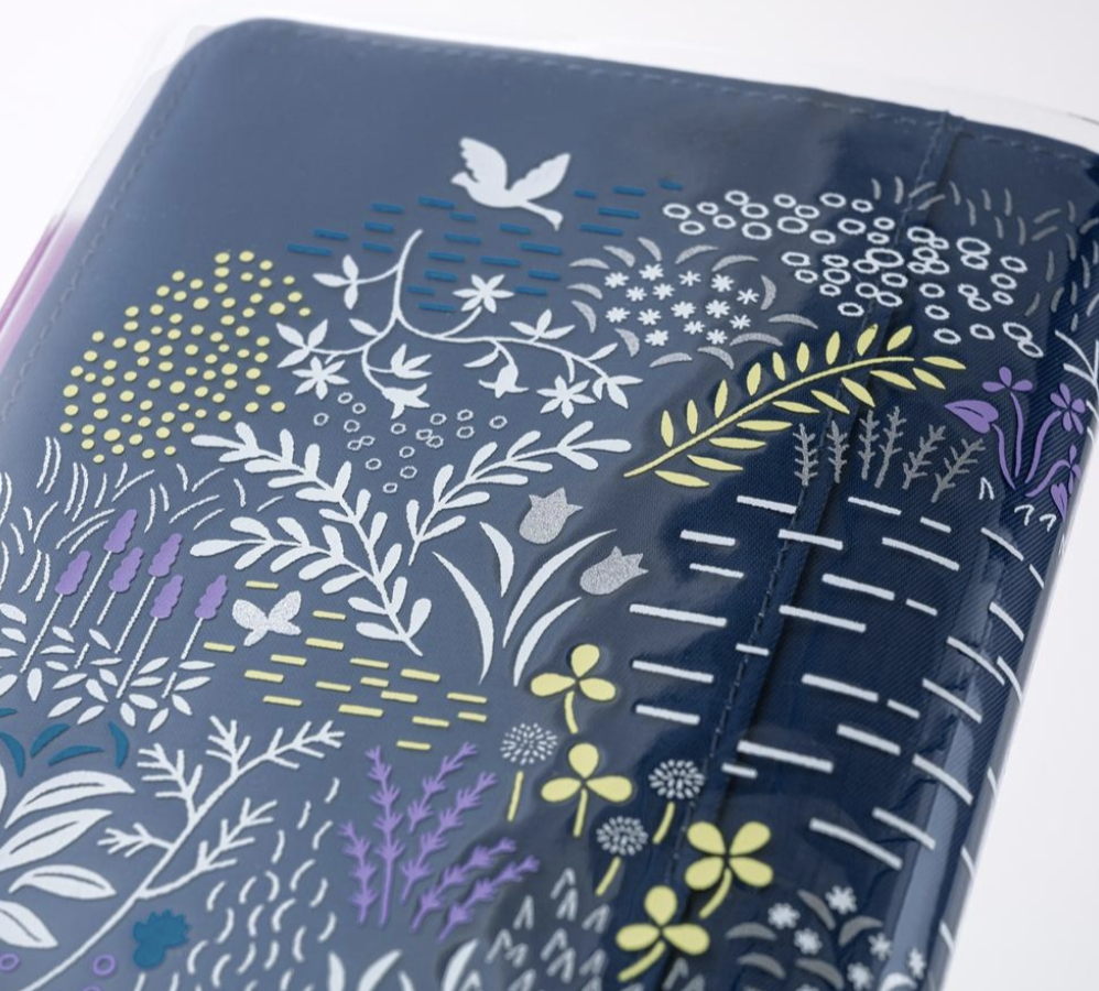 ▫ 圖案描繪了一片森林中的湖泊,周圍環繞著鮮花和綠植。採用黃色、深藍色和紫色印刷,並搭配白色和銀色油墨,營造出寧靜的感覺。